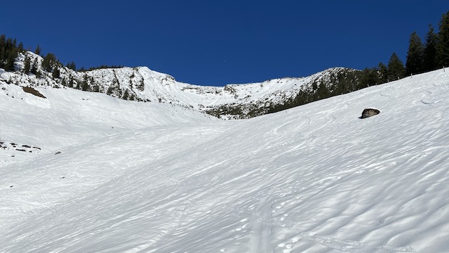 Kurzbeschreibung: Unten hart in der Sonne im steilen Südhang Firn.