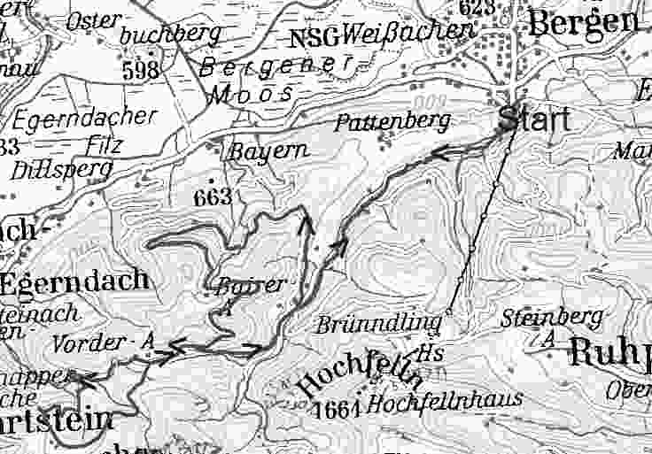 Die Tour führt vom Parkplatz erst links auf die Teerstraße Richtung Kohlstatt. Ab hier auf Schotter weiter am Engelstein (kurze Bergtour lohnend, da super Aussicht) vorbei. Ab hier den Wegweisern Baireralm folgen. Nach der Baireralm folgen wir der Beschilderung zur Vorderalm. Ab der Vorderalm geht's erst bergab, dann wieder hoch zur Staudacheralm. Er folgt nach kurzer Stärkung auf der Alm ein herrlicher Trial zurück zur Vorderalm. Ab hier geht's erst am Anfahrtsweg und später steil bergab zur Ausgangspunkt in Bergen.
