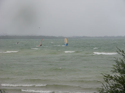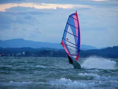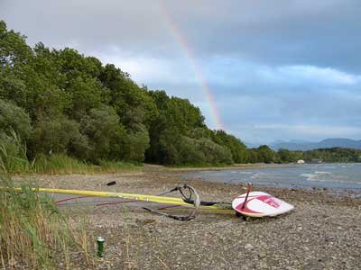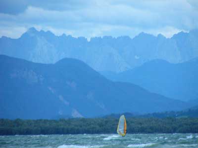 Das war wieder mal ein super Chiemseewochenende. Am Freitag ab 14:00 ging's mit dem 7,2er, ab 17:00 dann mit dem 5,8er bis es dunkel wurde. Am Samstag gab's erst mal typischen Chiemseewind ( 20min Wind dann wieder 20min kein Wind). Falls Wind ging war das 5,8er angesagt. Ab 14:00 wurde der Wind konstant und stärker. Segelgrößen von 5,0 bis 5,8 waren gefragt. Ich war am Freitag eine Stunde mit dem 7,2er und eine Stunde mit dem 5,8er am Wasser und das mit Shorty. Am Samstag surfte ich zwei Stunden mit dem 5,8er. In den Böen war ich da aber teilweise überpowert. Mein Brett an beiden Tagen Fanatic Tripple X 109. Am Samstag wäre es auch mit dem Waveboard gegangen, aber ich war zu faul zu wechseln.