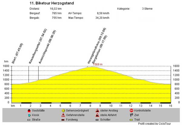 Mein Startpunkt ist ein Parkplatz 500 m vor Urfeld vom Walchensee her kommend. Wir bleiben auf der Teerstraße bis zum Kesselbergsattel (Km 1,7). Hier zweigen wir nach links auf einen Fahrweg Richtung Herzogstandhaus ab und folgen stets diesen Hauptweg. Bei km 2,7 schöner Aussichtspunkt. Beim Herzogstandhaus (Km 7,61) kann man noch links zur Bergstation der Herzogstandbahn (Km 8,08) weiterbiken. Zurück geht’s den gleichen Weg. Die Tour ist kurz aber teilweise sehr Steil. Achtung keine Anfängertour.