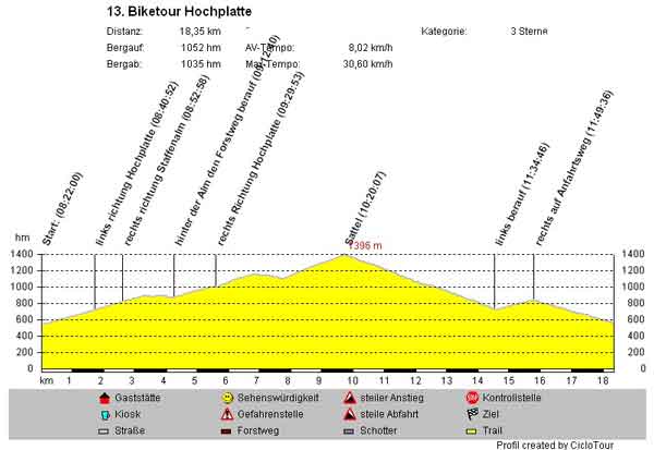 Die Tour beginnt beim Freizeitpark in Niedernfels. Von Parkplatz geht’s rechts einen Karrenweg bergauf. Bei km 1,70 links einen Pfad bergauf folgen, beim Pfadende rechts (km 2,60) den Forstweg später zu Pfad werdend über Almgelände zur Hefteralm folgen. Hinter der Hefteralm den Forstweg bergauf folgen. Bei km 5,59 links zugerst steil bergauf, später bergab. Km 7,80 hier rechts steil bergauf an der Hochplattenalm vorbei bis zum Sattel (höchster Punkt). Ab hier geht’s den gleichen Weg wieder zurück. Wir folgen immer den Hauptweg Richtung Marquartstein. KM 14,53 hier links einen Forstweg folgend wieder leicht bergauf. Bei km 15,78 den Anfahrtsweg in umgekehrter Richtung zum Ausgangspunkt folgen. Variante 2