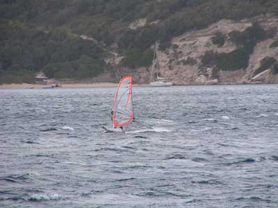 Nach zwei Tagen in Corte ging es wieder ans Meer. Diesmal wollte ich mir mal die Surfspots an der Südostseite der Insel anschauen. Angeblich sollte hier der Mistral aus Südwest kommen. Aber der Wind blies eher Ablandig. Die einzige Möglichkeit gefahrlos zu Surfen war in Santa Manza. Der Mistral wird hier angeblich noch verstärkt. Mit dem 4,5er und dem Waveboard ging's auch noch 30min ganz gut, dann wurde der Wind böig und ich musste das größere Board nehmen. Damit war's dann auch noch mal 30min gut. Leider ist es durch die lange Suche nach den geeigneten Spot ziemlich spät geworden und der Anfangs gute Mistral wurde immer böiger. Am nächsten Tag war's dann vorbei mit dem Wind und die Prognosen warn auch nicht wirklich viel versprechend, so beschloss ich Korsika zu verlassen und am Nachhauseweg noch für ein paar Tage am Gardasee zu bleiben.
