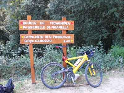 Die Tour beginnt am Strand von Calvi. Wir Biken auf die N197 und zweigen auf die D81 Richtung Forest de Bonifatu ab und folgen dieser Straße mit leichter Steigung am Flughafen vorbei und später etwas mehr ansteigend bis zur Hütte Bonifatu. km19,23 hier endet die Teersraße wir können aber noch auf den Forstweg etwas weiter Biken. Aber nach ca. 100hm ist dann Fußmarsch angesagt. Wir folgen der gelben Markierung zur Carrozzu-Hütte, ab der Hütte weiter nach Asco bis die Hängebrücke erreicht ist. Am Aufstiegsweg gibt's übrigens noch eine kleine Hängebrücke. Zurück geht's über den gleichen Weg.